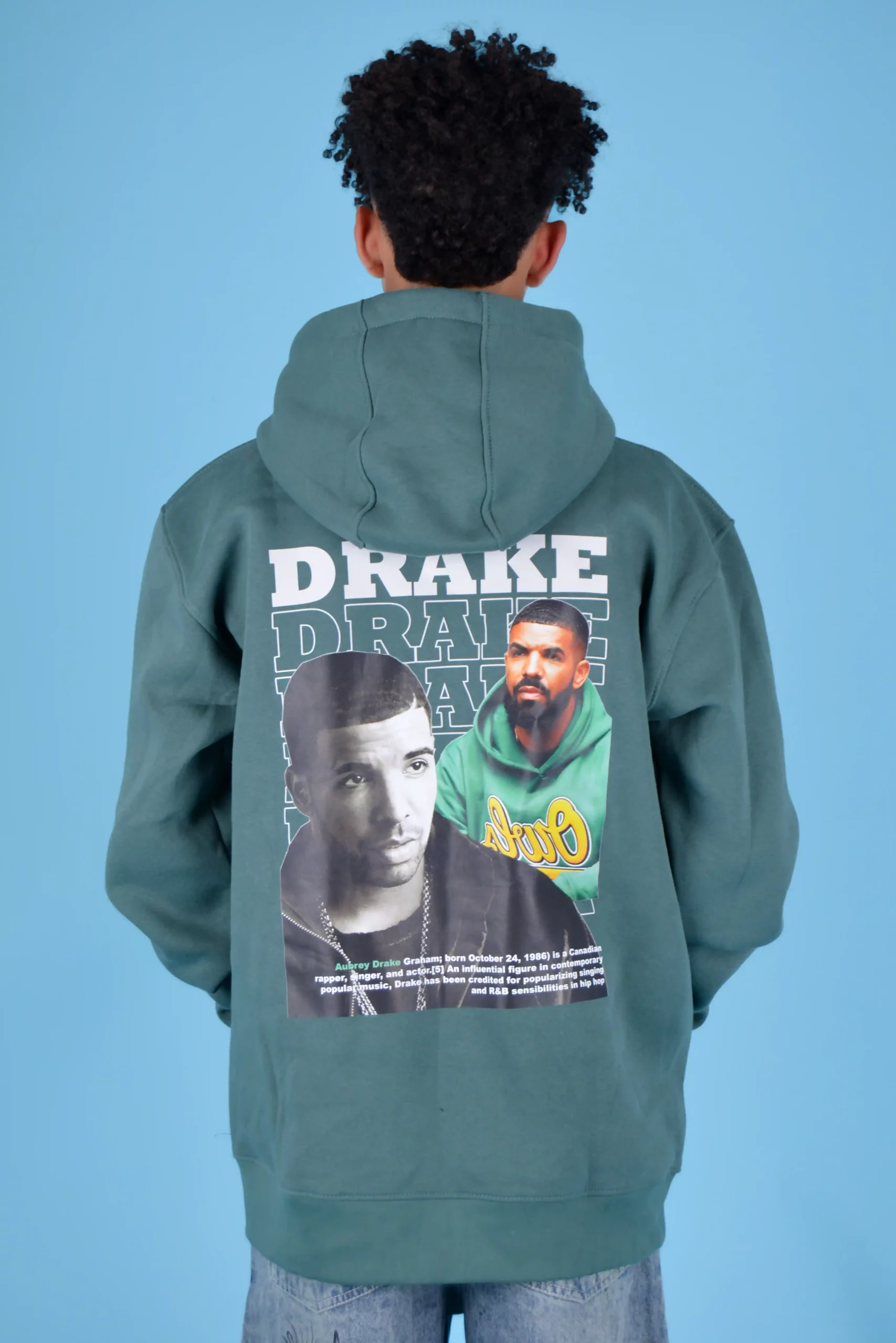 Celebrate the legend that is Drake with this Drake Hoodie, a visual tribute to one of the biggest names in global rap and R&B. This dark green hoodie showcases an original montage of several portraits of the artist, accompanied by a biographical text at the bottom, blending streetwear aesthetics with a deep appreciation for music. It’s the perfect piece for any true fan of Drizzy, combining style with musical passion.