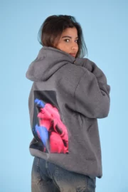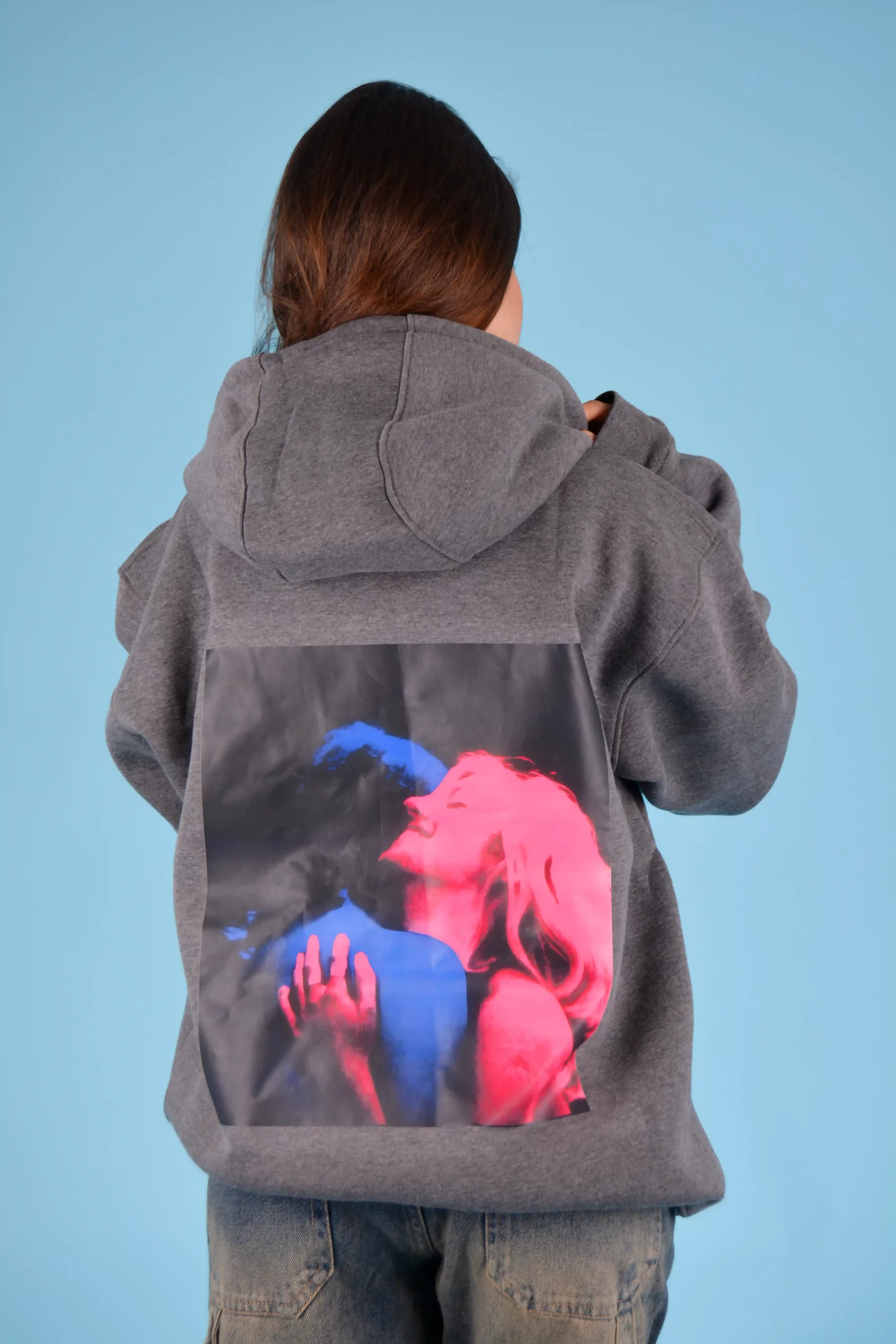 Express your personality with this striking and artistic hoodie. On the back, a powerful visual print blends passion and contrast through a duo image in electric shades of blue and pink. Crafted from quality cotton fleece, it ensures everyday comfort and style.
