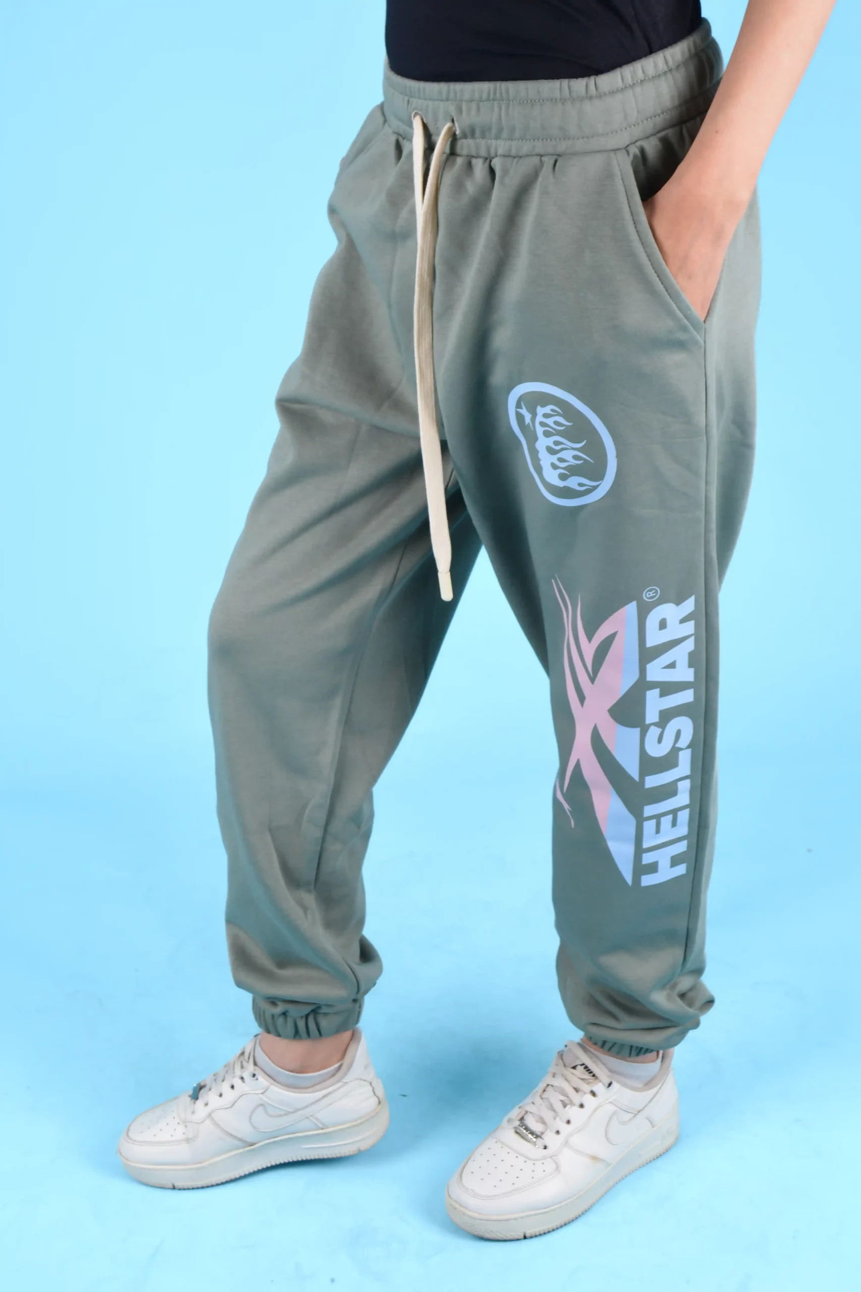 Khaki green joggers with a large HELLSTAR logo in pink and blue gradient on the leg, perfect for a bold street style.